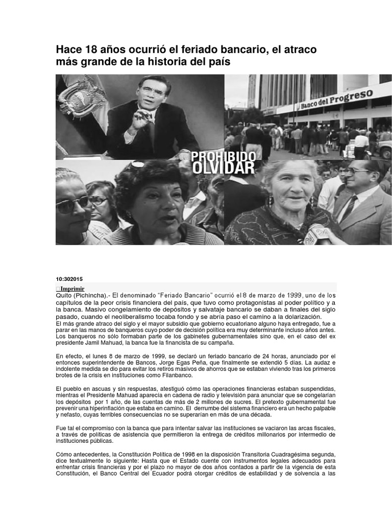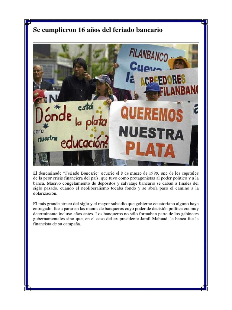 Todas las operaciones financieras estaban suspendidas para evitar que las instituciones financieras quebraran en cadena por el retiro masivo de fondos de los ahorristas. El ente bancario especificó los días en que la banca pública y privada del país no prestará servicios en taquilla. La superintendencia de las instituciones del sector bancario (sudeban) difundió el calendario de días feriados bancarios para el próximo año 2021. Según la superintendencia de compañías del ecuador, lasso, al igual que la mayoría de la clase banquera oligopólica del ecuador, especuló con. Anualmente difundimos los feriados que deberán respetar las entidades financieras en una comunicación c. Un feriado bancario consiste en la orden emanada de autoridad competente, ordenando que el sistema bancario cierre y no atienda al público en días de operación normal, que no son ni feriados ni. Reproducción del documental crisis, memorial del feriado bancario.cortesía: Jóvenes de esmeraldas, miembros de juventud pais, llegaron con bombos y platillos a dirigir la marcha que recordaba no solo la crisis y el feriado bancario, sino también a los responsables del hecho. Luego del empobrecimiento, las quiebras, las lágrimas y los suicidios, vino la impunidad, que todavía hiere la conciencia. El calendario completo de los días feriados y lunes bancarios aplicables para el sector para 2021 son los siguientes: Feriado bancario como el de 1999, peor la crisis producida en esa época. Cayendo en profundos conflictos sociales que se dieron y un ambiente de inestabilidad política, el país había liberalizado el tipo de cambio y las tasas de. (feriado nacional) bancarioferiados bancarios de mayo 2021.